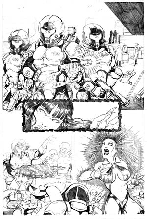 Drawn from a Vampirella script. Vampi gets confronted by security. They surround her. She proceeds to attack them and gets tasered for her trouble.